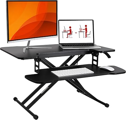 Fezibo standing desk converter stand up desk riser, 34 inches height adjustable ergonomic tabletop workstation riser fits dual monitors black.